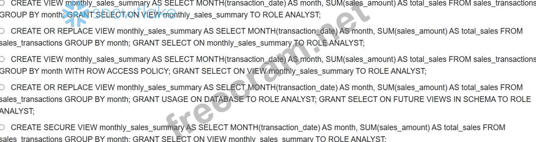 Option B correctly creates or replaces the view to aggregate sales data by month and then grants the SELECT privilege on the view to the `ANALYST role, enabling them to query the view. Option A will fail if the view already exists. Option C incorrectly adds row access policy which is not necessary here. Option D is about Future grants and not correct here. Option E Creates a secure view, while correct is not the most optimal or requested answer to resolve the problem statement.