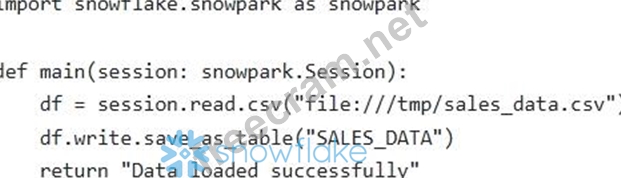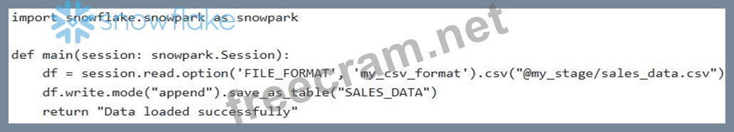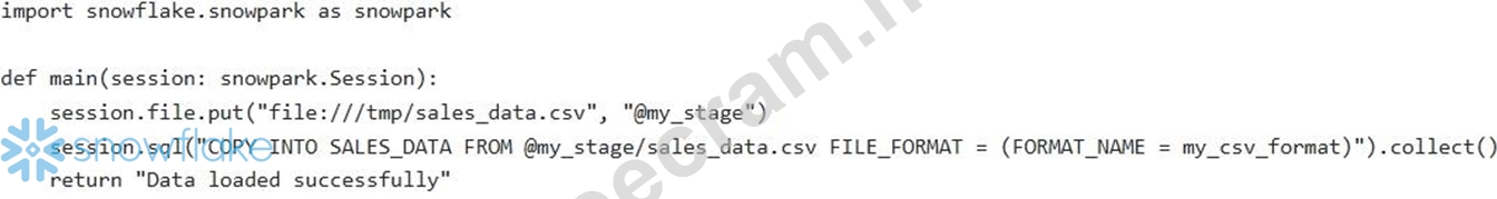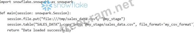 The `copy_into' method available on Snowpark DataFrame/Table objects allows you to leverage Snowflake's native COPY command for efficient data loading. Option C correctly uses `session.table("SALES_DATA").copy_into("@my_stage/sales_data.csv", to perform the copy operation. Options A and D do not utilize the COPY command directly and might not be as optimized. Option B uses session.sql which doesn't leverage Snowpark's DataFrame API. Option E incorrectly defines the file_format as a dictionary. The 'file_format' parameter expects only the name of existing File Format Object.