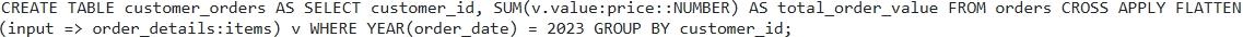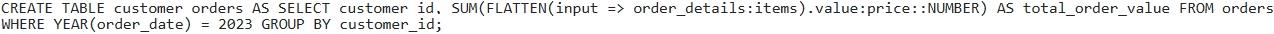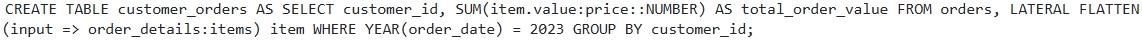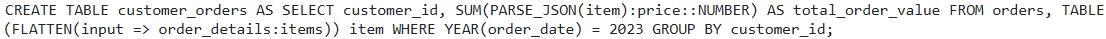 Option D provides the most optimized and correct solution. Using 'CROSS APPLY FLATTEN' (or `LATERAL FLATTEN' which is equivalent) efficiently un-nests the `items' array. Filtering by = 2023' before the 'FLATTEN' operation can significantly improve performance by reducing the number of rows processed by the FLATTEN' function. Option A is syntactically correct, however CROSS APPLY is preferrable to use for readability. Option B is incorrect. It attempts to use array slicing syntax which is not valid for summing the prices of all items within the array. Option C is incorrect. The is unnecessary as the 'item' is already a JSON object. The correct syntax is 'item.value' when using Option E is invalid syntax. The FLATTEN function is not valid inside SUM.