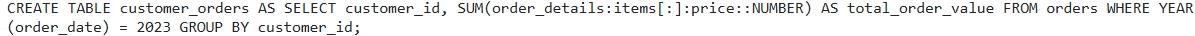 A data warehouse contains a table 'orders' with columns 'order_id', 'customer_id', 'order_date' , and 'order_details' (VARIANT type containing nested JSON). You need to create a new table 'customer_orders' that aggregates the total order value per customer for orders placed in the year 2023. The order value is calculated as the sum of the 'price' field for each item in the 'items' array within the 'order_detailS JSON. Which of the following SQL statements achieves this with optimal performance, assuming a large dataset and leveraging best practices for querying VARIANT data?