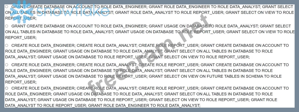 Option E is the most complete answer. It creates the roles, grants necessary database creation privileges to DATA_ENGINEER, allows DATA ANALYST to use and query the database, and REPORT USER to use the database and select from the specified view. The role grants establish the hierarchy. Options A and B have incorrect grant statements for select on all tables in the database and lack the creation of Roles at the begining. Option D does not grant the roles to each other, leaving the hierarchy incomplete, and incorrectly attempts to grant select on future tables directly to a view.