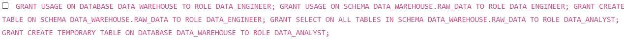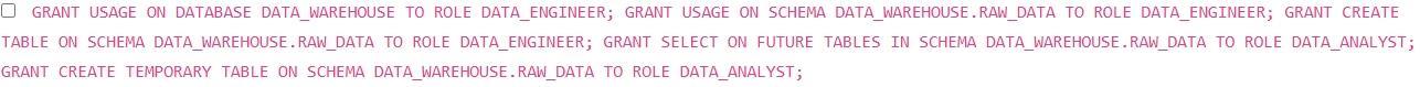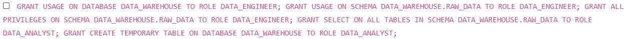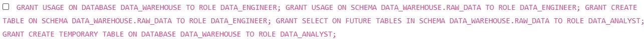 Options A and B are correct because they grant the necessary privileges to the 'DATA_ENGINEER and "DATA_ANALYST roles. Option A uses FUTURE grants to the DATA ANALYST role; any new tables created will grant select permissions automatically. Option B explicitly grants SELECT on ALL TABLES, meaning it's a one-time grant. Option C grants ownership, which allows the to drop tables created by other roles. Option D grants ALL PRIVILEGES, which allows the 'DATA ENGINEER to drop tables created by other roles. Option E grants create temporary table on SCHEMA, it has to be on DATABASE.