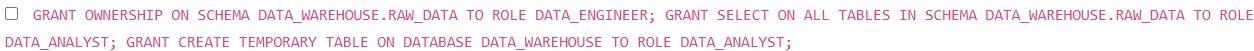 You are designing a data warehouse in Snowflake and need to implement a role-based access control (RBAC) system. You have the following requirements: A 'DATA ENGINEER role that can create and manage tables, views, and other objects in the 'RAW DATA' schema. A 'DATA ANALYST role that can query data from tables and views in the 'RAW DATA' schema and create temporary tables for their analysis. Neither role should be able to drop tables owned by the other role. Which set of SQL statements will correctly implement the desired RBAC system? (Select two that apply.)