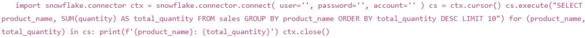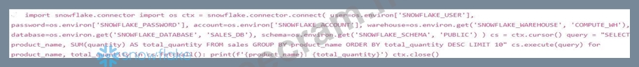 You are developing a Snowflake Notebook to analyze sales data. You need to connect to a Snowflake database using Python and execute a query to retrieve the top 10 products by sales volume. Which of the following code snippets is the MOST efficient and secure way to achieve this, assuming you've already configured the necessary connection details and have 'snowflake.connector' installed?