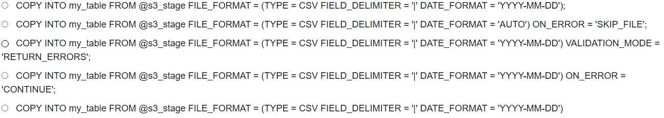 Option A correctly specifies the custom field delimiter (FIELD DELIMITER = and the explicit date format (DATE FORMAT = 'YYYY-MM-DD") to handle the CSV loading and date transformation requirements effectively. Option B uses 'DATE_FORMAT = 'AUTO" , which might not correctly parse the date if it's not in a standard format. Options C, D and E don't contain 'ON ERROR to ensure that, in case of error the load continues