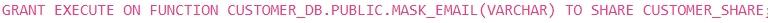 This database contains a table 'CUSTOMER INFO and a secure UDF `MASK EMAIL'. You need to grant the necessary privileges on the share such that consumers can use both the table and the UDF. Which of the following SQL statements are required to properly configure the share named 'CUSTOMER SHARE? (Select all that apply)