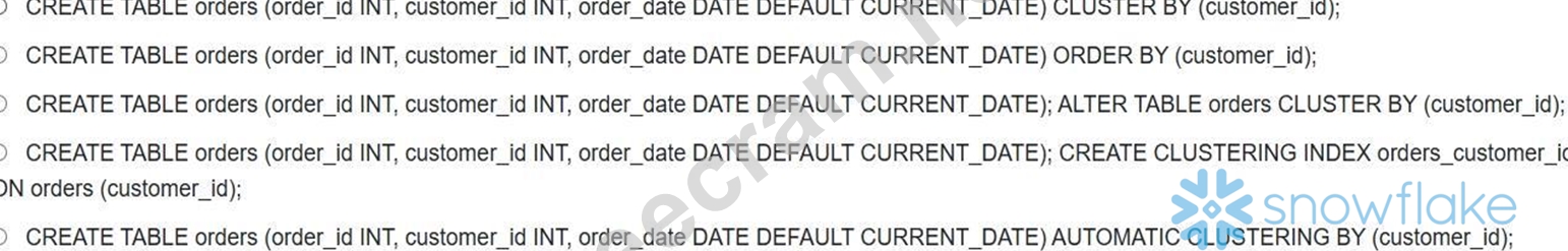 Option A is correct because it creates a table with a default value for 'order_date' using 'DEFAULT CURRENT_DATE and specifies clustering on 'customer_id' using `CLUSTER BY (customer_id)' during table creation. Snowflake supports specifying clustering keys during table creation. Option B is incorrect because 'ORDER BY' clause is used for ordering the data during query, not for clustering. Option C is also correct as the 'CLUSTER BY' can be done using ALTER statement as well . Option D is incorrect because Snowflake does not use traditional indexes and the syntax 'CREATE CLUSTERING INDEX is invalid. option E is incorrect because 'AUTOMATIC CLUSTERING BY' is not a valid syntax.