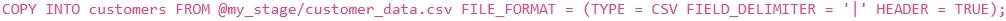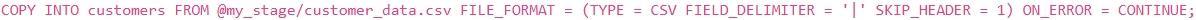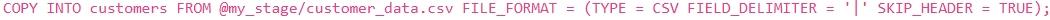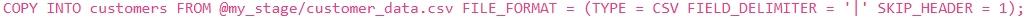 You are tasked with loading data from a large CSV file located in an internal stage named `my_stage'. The CSV file contains customer data with columns: , 'first_name', 'last_name' , and 'email'. The file is pipe-delimited and the first row contains headers. You want to load this data into an existing table named The `customers' table already has the columns defined correctly, and you want to skip the header row during the load. Which 'COPY INTO' statement is the MOST efficient and correct way to achieve this?