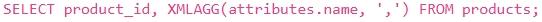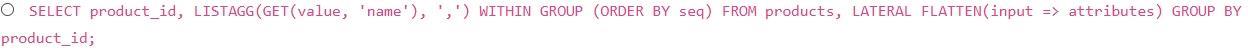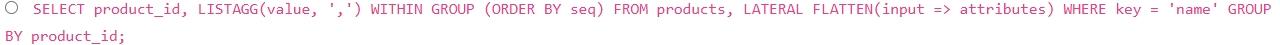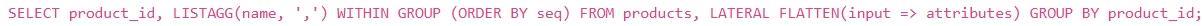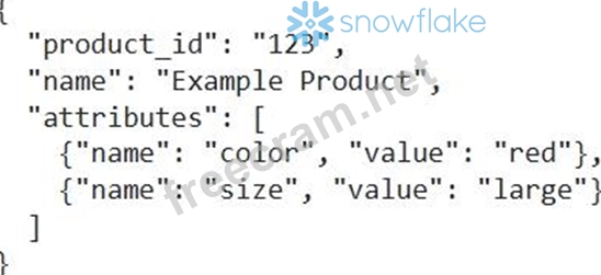 You are working with a semi-structured JSON dataset containing information about products. The JSON structure is as follows: You need to extract all the `name' attributes from the `attributes' array into a single comma- separated string for each product. Which of the following Snowflake SQL statements would achieve this?
