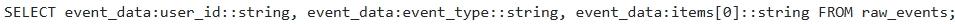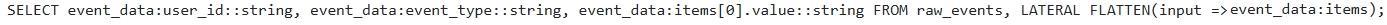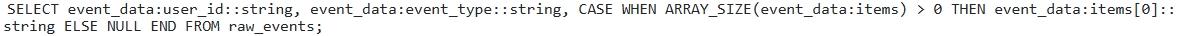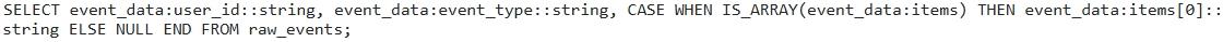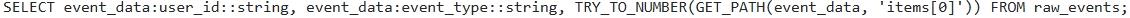 You have a table named 'raw_events' with a VARIANT column called containing JSON data. The JSON structure has varying levels of nesting. You need to extract the 'user_id', 'event_type', and the first element of the 'items' array (if it exists) for each event. Which of the following SQL queries is the MOST efficient and correct way to achieve this?