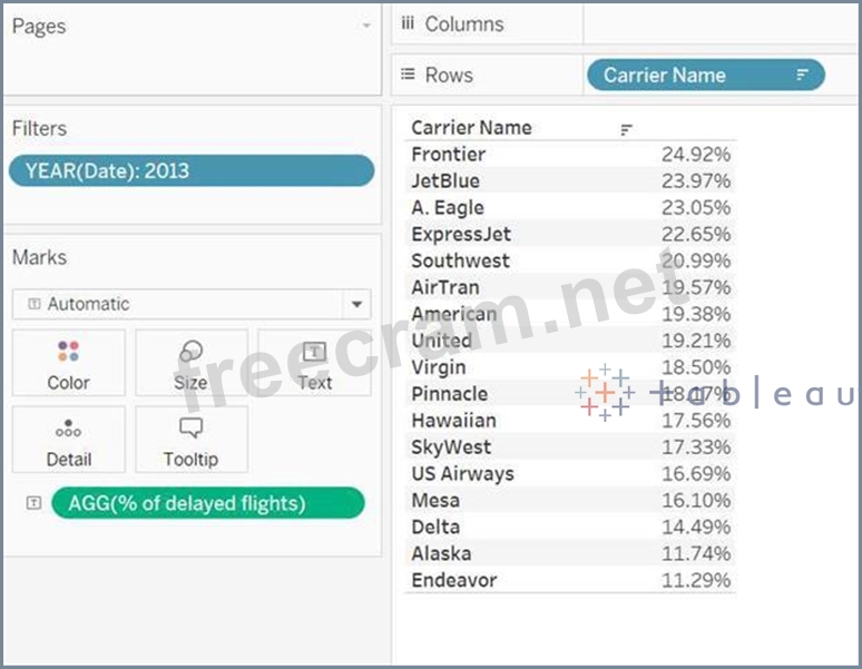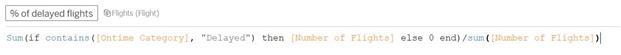 Explanation Create the calculated field: Drop the carrier name to the view and % of delayed flights to text. We only have 2013 data, so filter won't make a difference:
