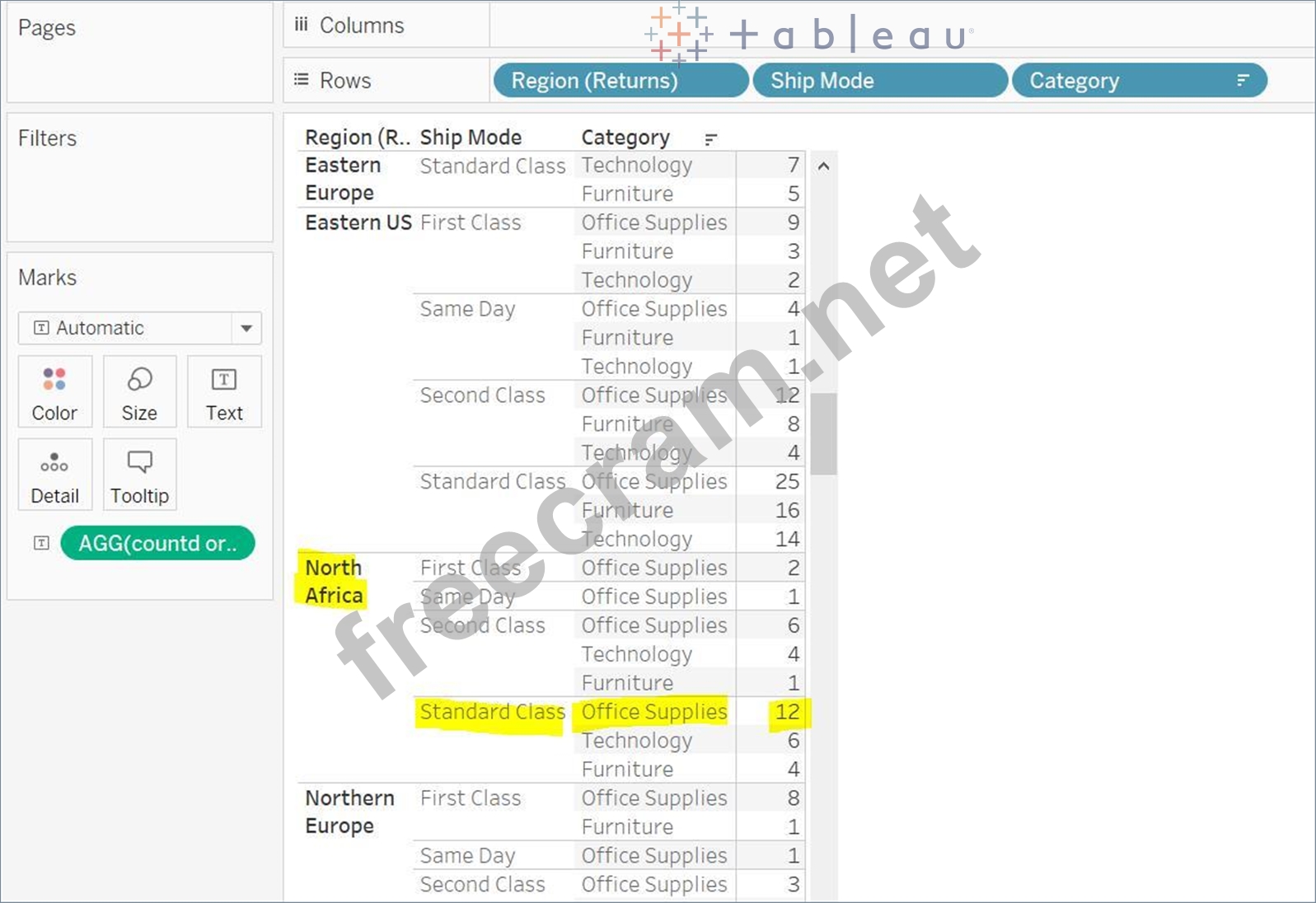 Drop Region, Ship Mode, and Category to Rows. And drop 'countd order' field to Text. The final view would look like this: