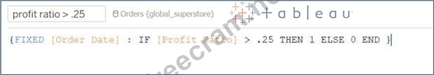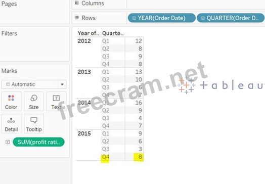 Explanation Calculate the Profit Ratio: Create a LOD expression -> for each order date if profit ratio is greater than 25% returns 1. Drop the Order date to Rows and drill-down it to Quarters. Drop the profit ratio >.25 field to Text: