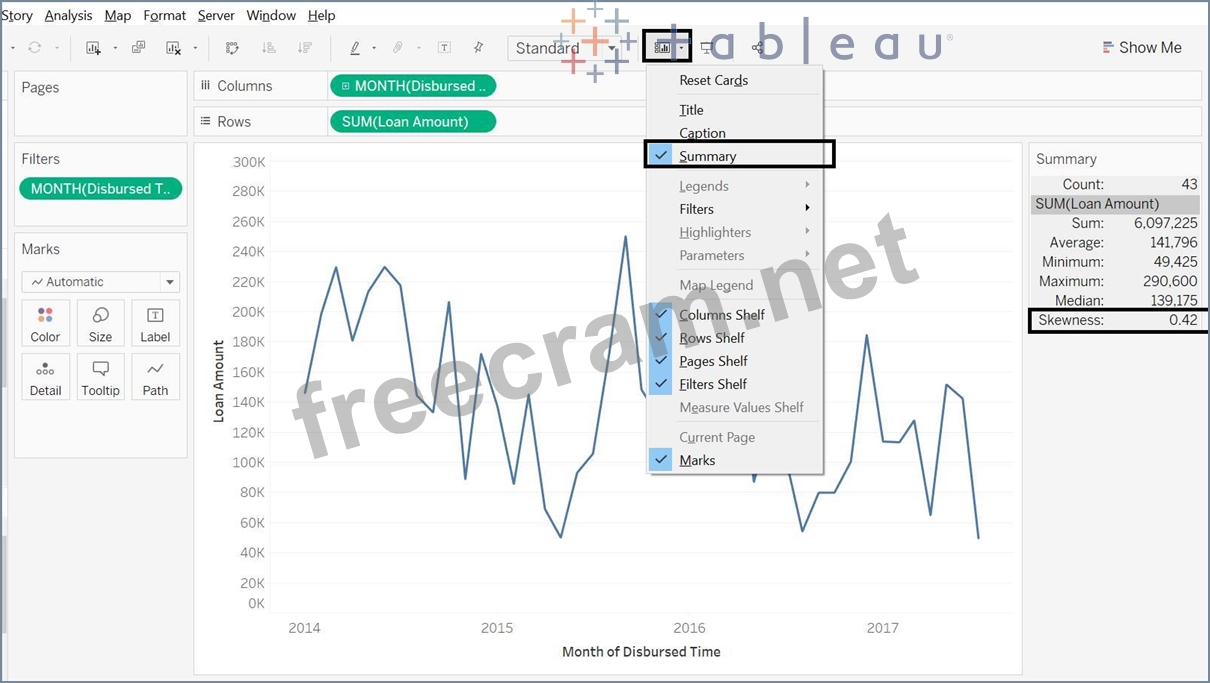 Enable the Summary Card from Show/Hide menu as shown: Skewness is .42 Graphical user interface, chart Description automatically generated