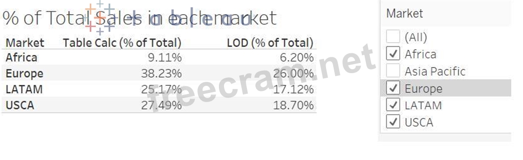 Why might this LOD expression for percent of total sales give different results than a table calculation for percent of total sales? Larger image