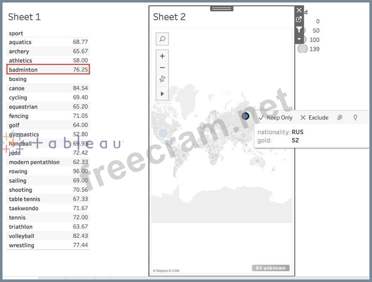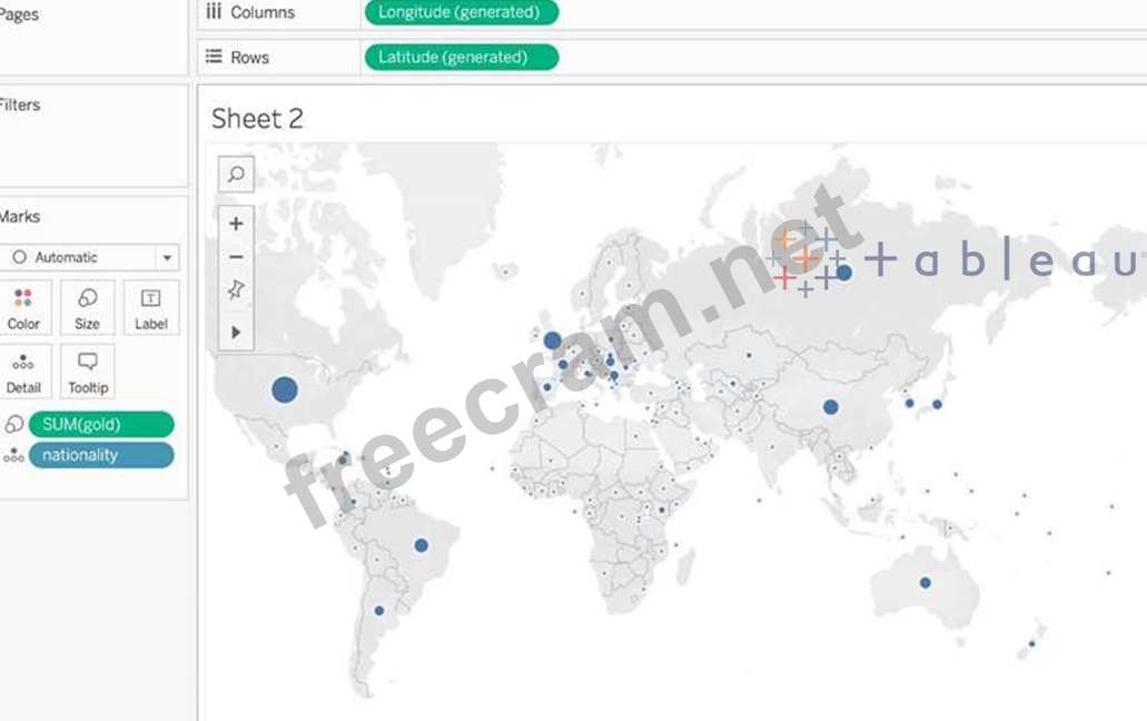 2) Now, for sheet 2 - Drag nationality to the view, and gold to the size mark in the Marks shelf.