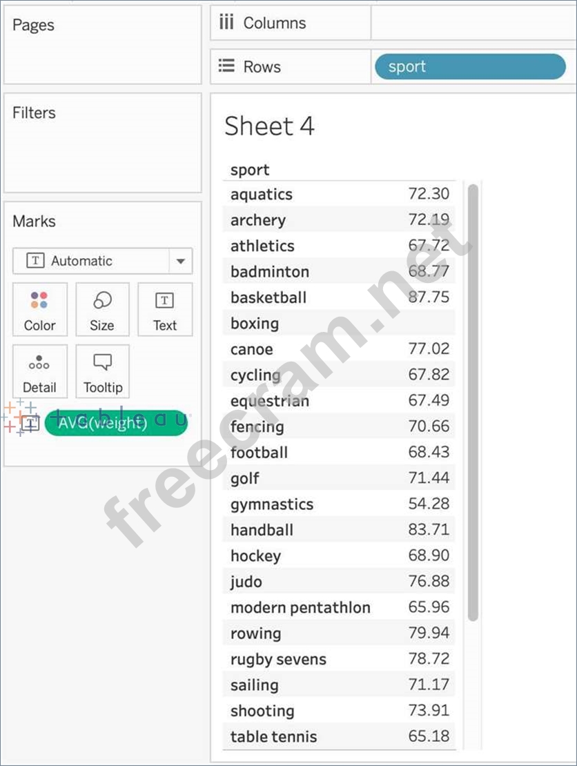 1) First, lets create Sheet 1. For this, drag sport to the Row shelf, and Weight to the Text mark in the Marks shelf. Change its aggregation to Average:
