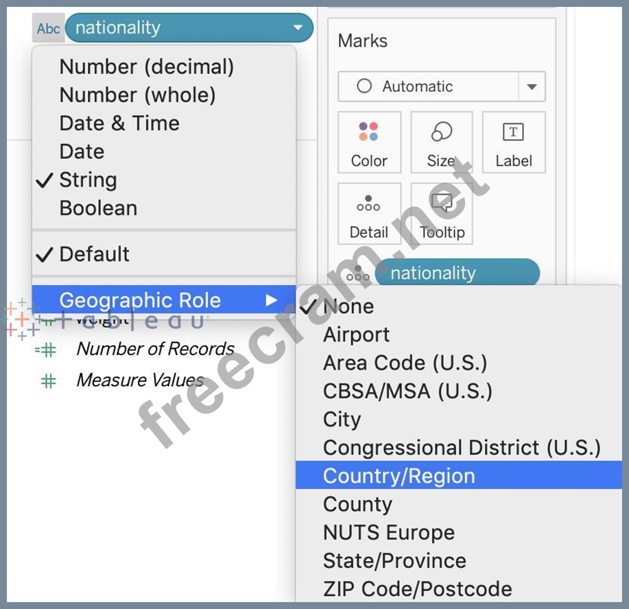NOTE: Depending on your version of Tableau , you may need to assign a Geographical role to the nationality column first as follows: