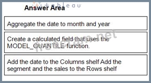 1 - Aggregate the date to month and year 2 - Create a calculated field that uses the MODEL_QUANTILE function. 3 - Add the date to the Columns shelf Add the segment and the sales to the Rows shelf