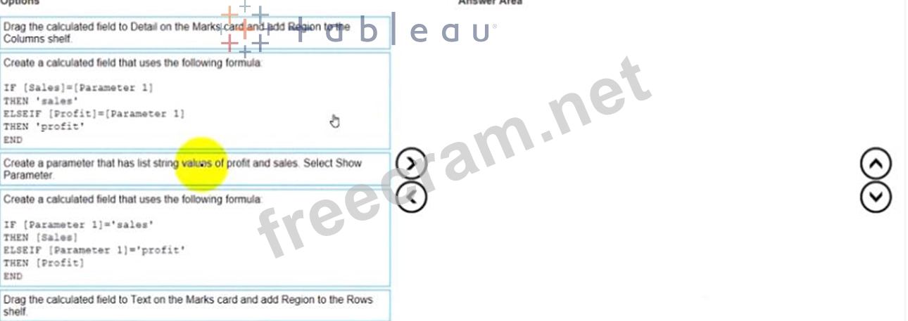 You have the following dataset. You need to create the following worksheet. The table must show either profit or sales based on the selection from the Parameter 1 menu. Which three actions should you perform in orders (Place the three correct options in order Use the arrows to move Options lo Answer Area Use Answer Area arrows to reorder the options)