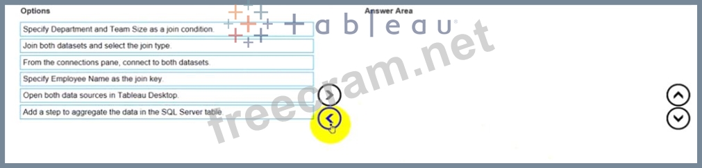 You have the following two datasets: * A Microsoft Excel worksheet that has two columns named Employee Name and Department * A Microsoft SQL Server table that has three columns named Employee Name. Pay Grade and Team Size. You want to use Tableau Prep to join the two datasets. Which three actions should you perform m order? (Place the three correct options in order.)