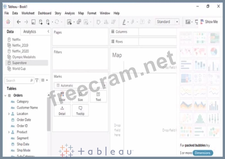 check the steps below in explanation. Explanation: To create a filled map to show the distribution of total Sales by State across the United States, you need to do the following steps: Open the link to Book1 found on the desktop. This will open the Tableau workbook that uses the Superstore data source. Click on the Map tab at the bottom of the workbook to open the Map worksheet. You will see a blank worksheet with no marks. Drag State from the Dimensions pane to Detail on the Marks card. This will create a map that shows each state as a mark. You may need to zoom in or out to see the whole map. Drag Sales from the Measures pane to Color on the Marks card. This will create a filled map that shows the distribution of total Sales by State across the United States. The color legend will show you the range of values and colors for Sales. Optionally, you can adjust the color scheme, transparency, size, and borders of the marks by clicking on the Color menu on the Marks card. You can also add labels, tooltips, or filters to enhance your map. References: https://help.tableau.com/current/pro/desktop/en-us/maps.htm https://help.tableau.com/current/pro/desktop/en-us/maps_howto_filled.htm https://help.tableau.com/current/pro/desktop/en-us/marks_markproperties_color.htm
