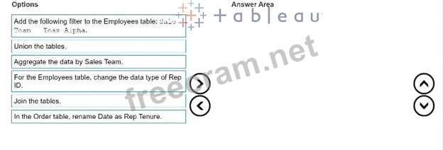 To analyze sales trends over time for every sales team, you need to combine the data from the Orders and Employees tables. You can do this by joining the tables on the Rep ID column, which is a common identifier for both tables. This will create a single table with all the columns from both tables. Next, you need to aggregate the data by Sales Team, which is the level of analysis you want. You can do this by grouping the data by the Sales Team column and applying an aggregation function (such as sum, average, count, etc.) to the other columns that you want to measure (such as Total Amount, Rep Tenure, etc.). This will create a summary table with one row for each sales team and the aggregated values for the other columns. Finally, you need to filter the data to focus on a specific sales team, such as Team Alpha. You can do this by adding a filter to the Employees table and selecting only the rows where Sales Team equals Team Alpha. This will remove the rows for other sales teams and keep only the data for Team Alpha.
