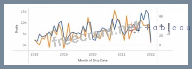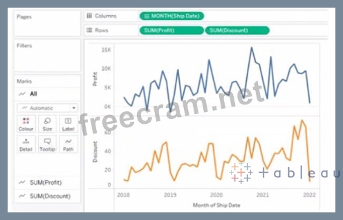 To combine the lines to appear as shown in the second chart, you should set Discount to Dual Axis. Dual Axis is a feature that allows you to show two measures on two separate axes on one chart. You can create a dual axis by right-clicking on a measure on any shelf and selecting Dual Axis from the menu. This will create two axes on one chart and synchronize their scales. In this case, you want to show Profit and Discount on two separate axes on one chart. You can right-click on Discount on any shelf and select Dual Axis from the menu. This will create a dual axis chart that shows Profit and Discount as two lines with different colors. The other options are not correct for this scenario. Dragging Discount to Color on the Marks card will change the color of Profit based on Discount, but it will not show two lines. Converting Discount to Discrete will change Discount from a green pill to a blue pill, but it will not affect how it appears on the chart. Dragging Discount to Columns shelf will create two separate charts for Profit and Discount, but it will not combine them. References: https://help.tableau.com/current/pro/desktop/en-us/multiplemeasures.htm https://help.tableau.com/current/pro/desktop/en-us/multiplemeasures_dualaxes.htm