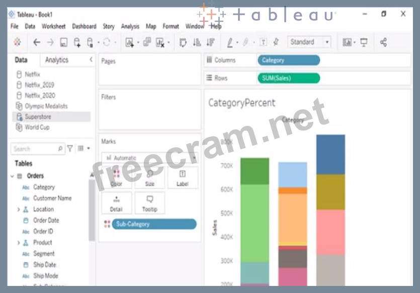 To modify the bar chart to show the percentage of sales for each Subcategory within every Category, you need to do the following steps: Open the link to Book1 found on the desktop. This will open the Tableau workbook that contains the CategoryPercentage worksheet. Click on the CategoryPercentage tab at the bottom of the workbook to open the worksheet. You will see a bar chart that shows the total sales for each Subcategory across all Categories. Right-click on Sales on the Columns shelf and select Add Table Calculation from the menu. This will open a dialog box that allows you to apply a calculation to your measure. Select Percent of Total from the Calculation Type drop-down list. This will calculate the percentage of sales for each Subcategory out of the total sales for all Subcategories. Select Category from the Compute Using drop-down list. This will calculate the percentage of sales for each Subcategory within every Category, instead of across all Categories. The total percentage for every Category will be 100%. Click OK to apply the table calculation. You will see that the bar chart now shows the percentage of sales for each Subcategory within every Category.