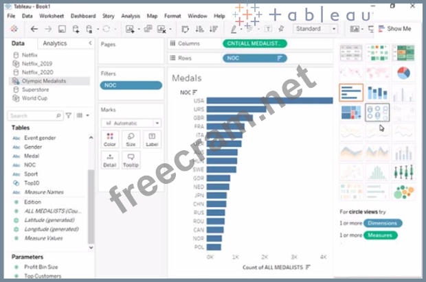 check the steps below in explanation Explanation: To filter the table to show the Top 10 NOC based on the number of medals won, you need to do the following steps: Open the link to Book1 found on the desktop. This will open the Tableau workbook that contains the Disciplines worksheet. Click on the Disciplines tab at the bottom of the workbook to open the worksheet. You will see a table that shows the NOC, discipline, and medals for each country. Drag Medals from the Measures pane to the Filters shelf. This will open a dialog box that allows you to filter by different criteria. Select Top from the dialog box. This will show you options to filter by the top or bottom values of a field. Enter 10 in the text box next to By field. This will filter by the top 10 values of Medals. Select NOC from the drop-down list next to By field. This will filter by the top 10 values of NOC based on Medals. Click OK to apply the filter. You will see that the table now shows only 10 rows, one for each NOC with the highest number of medals.