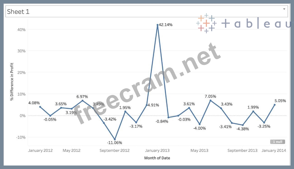 Using the CoffeeChain table, create a chart to see the monthly Percent difference change in Profit, from the beginning of 2012 to the end of 2013. How many months saw a Negative percent difference in Profit?