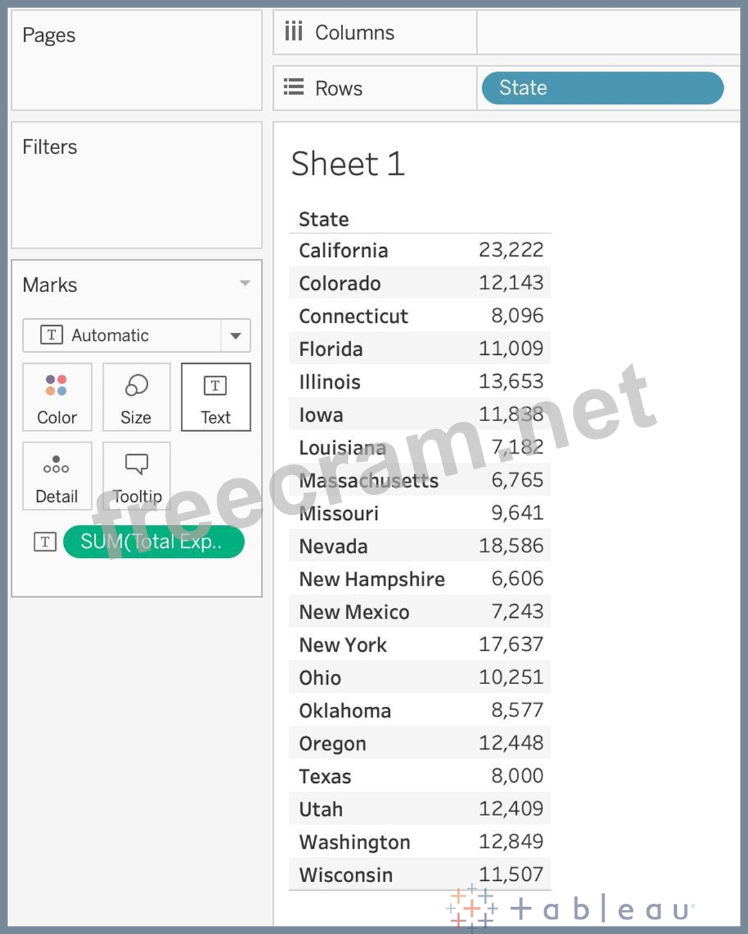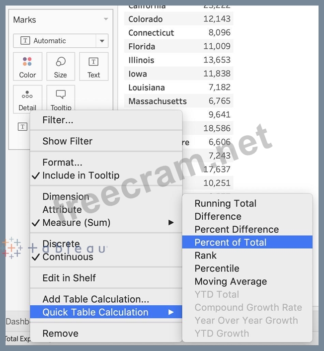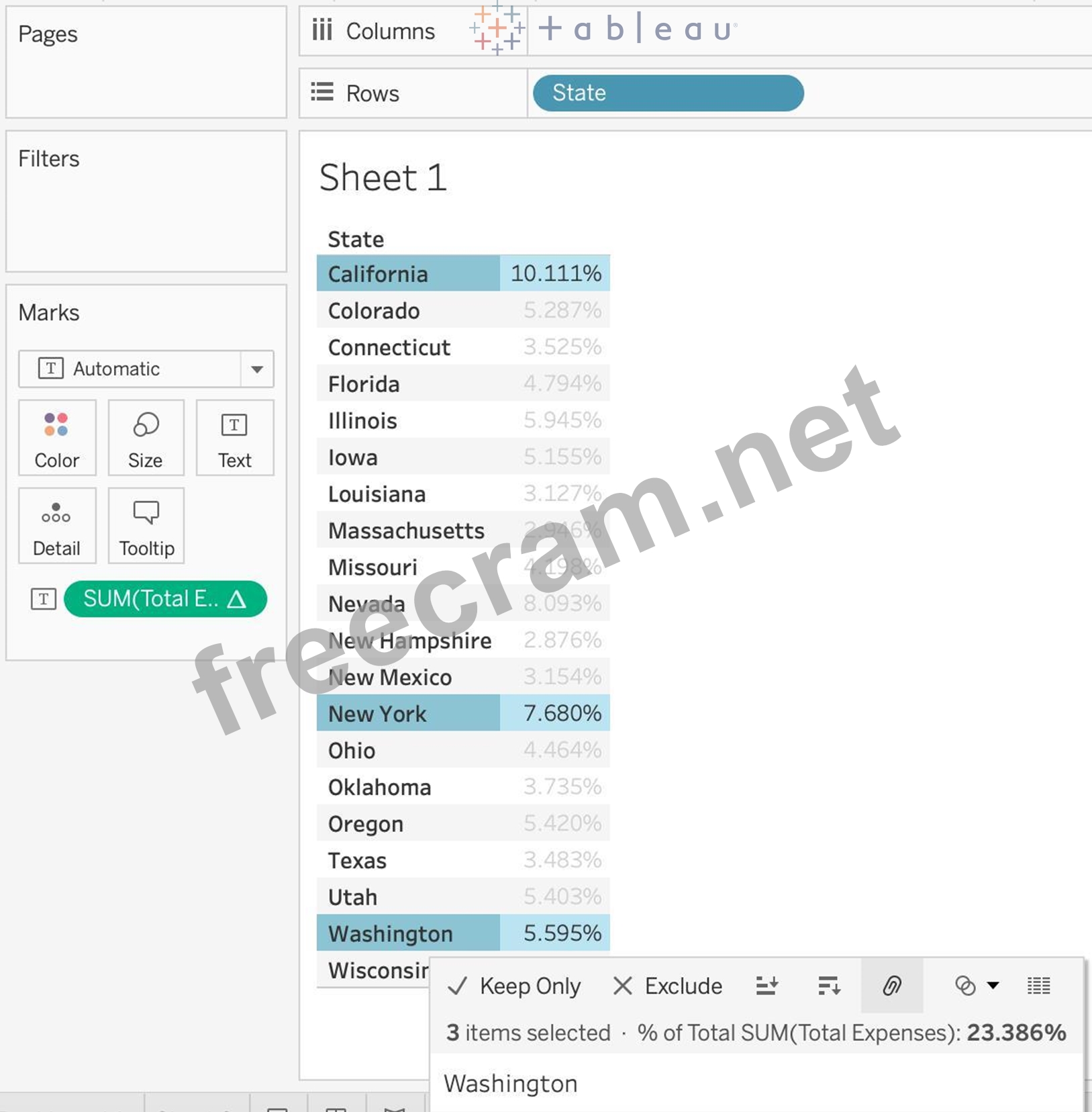 Using the CoffeeChain table, create a crosstab showing the Total Expenses per State and add Column Grand Totals to the view. Now group the states of New York, California and Washington. What percent of the total sales does this group contribute?