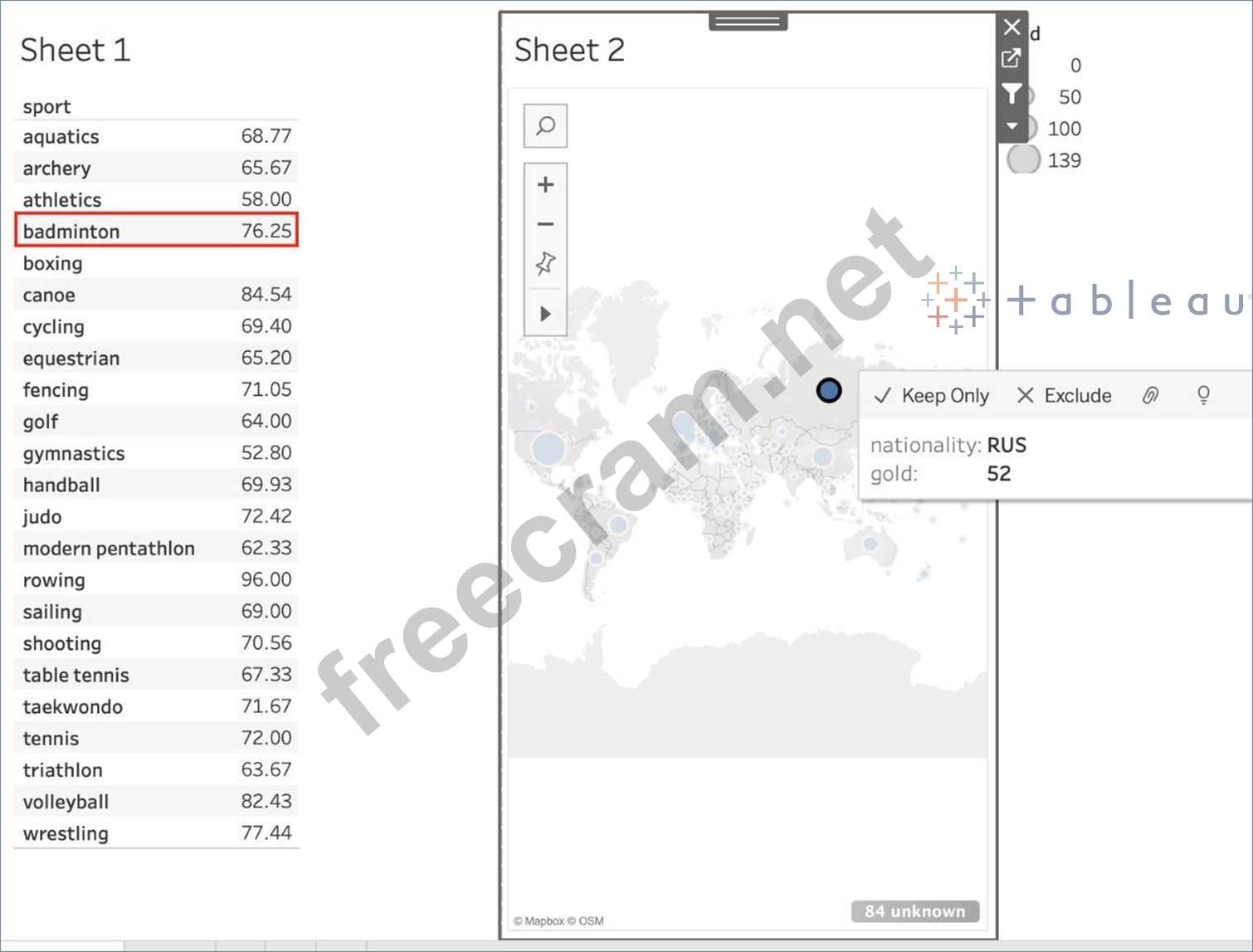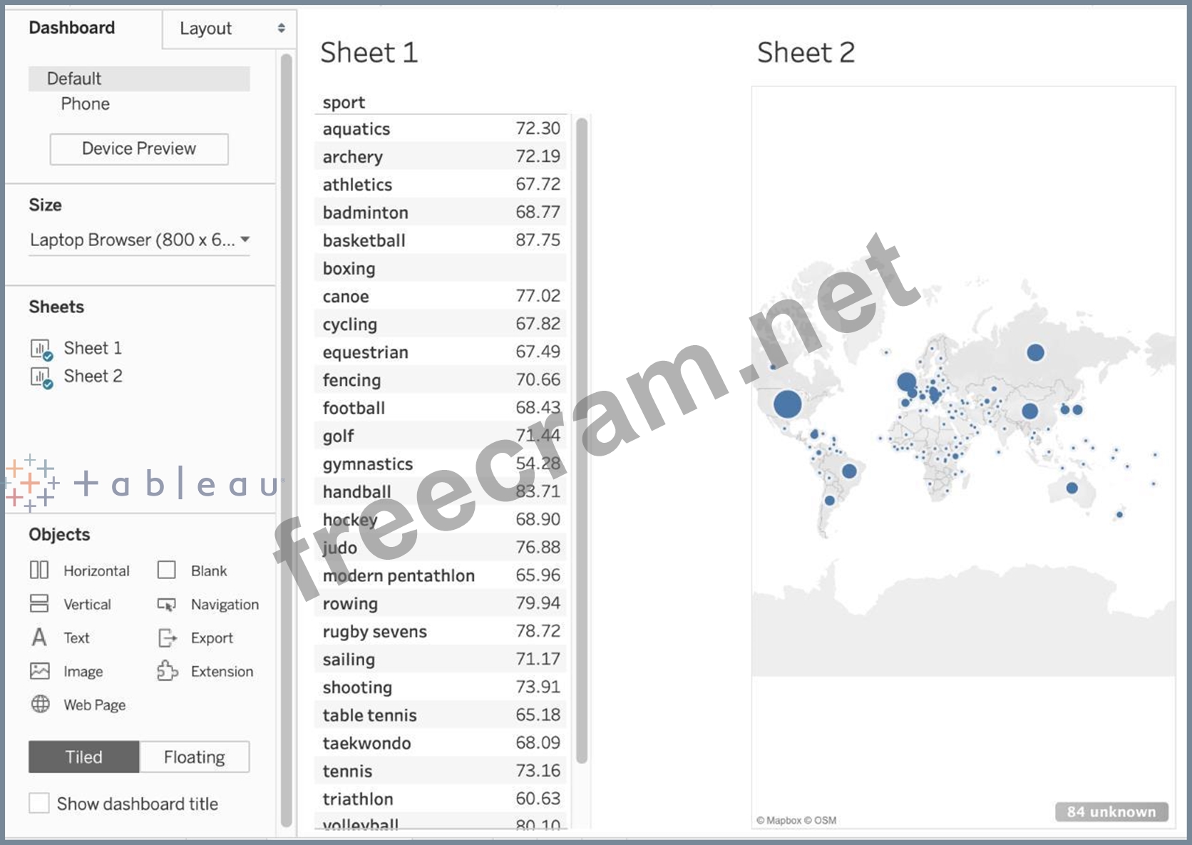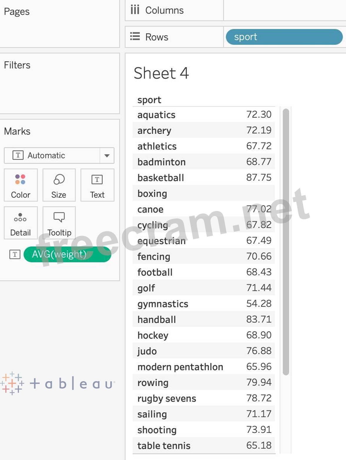 1) First, lets create Sheet 1. For this, drag sport to the Row shelf, and Weight to the Text mark in the Marks shelf. Change its aggregation to Average: