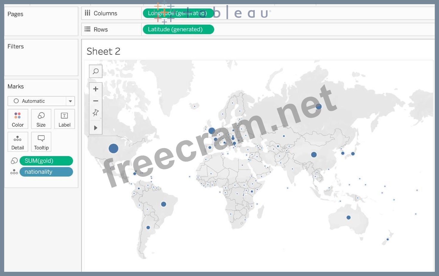 2) Now, for sheet 2 - Drag nationality to the view, and gold to the size mark in the Marks shelf.