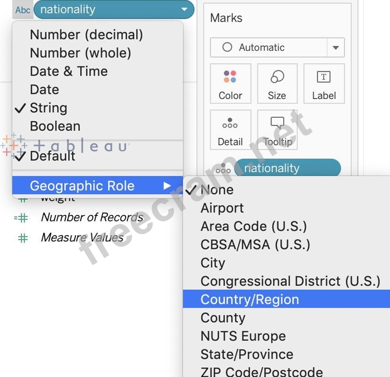 NOTE: Depending on your version of Tableau , you may need to assign a Geographical role to the nationality column first as follows: