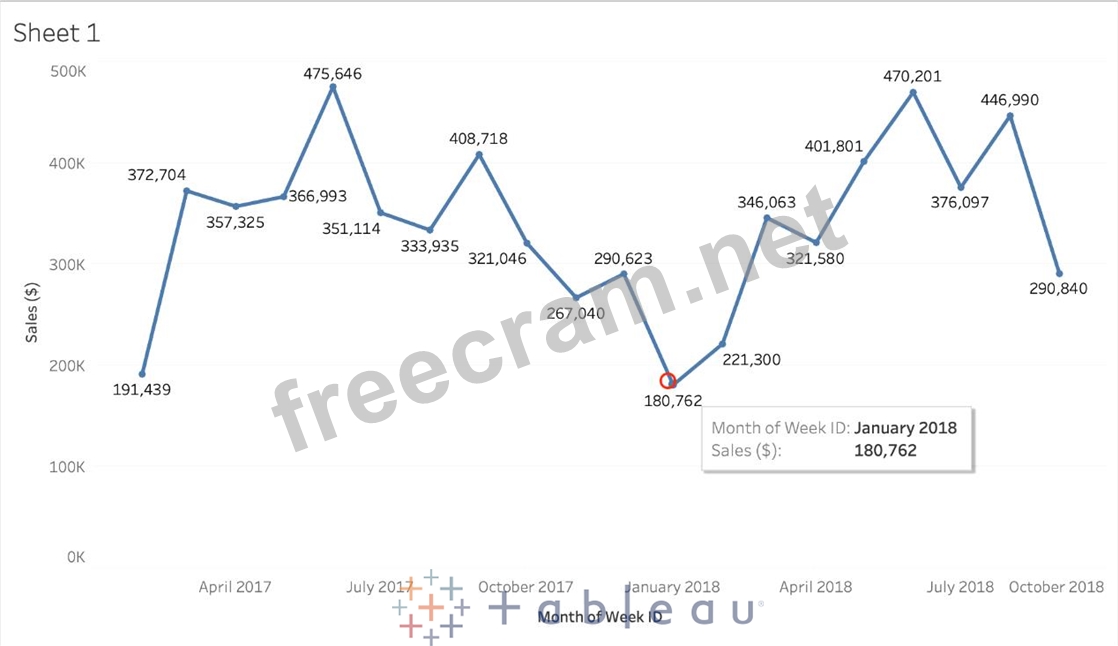 Download the Dataset from: https://drive.google.com/file/d/12AYHfiPWkwBmvH0zbumOURgUX6Az00Rw/view?usp=sharing Using the Time Series Table, create a line chart to show Sales over time. Which Month and Year witnessed the lowest Sales?