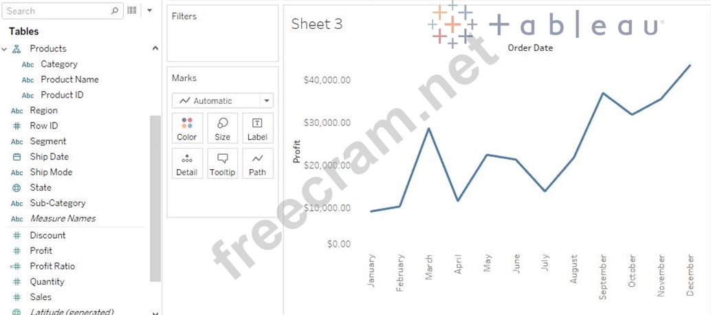 In this example, the Sales axis is the secondary axis and the Profit axis is the primary axis.
