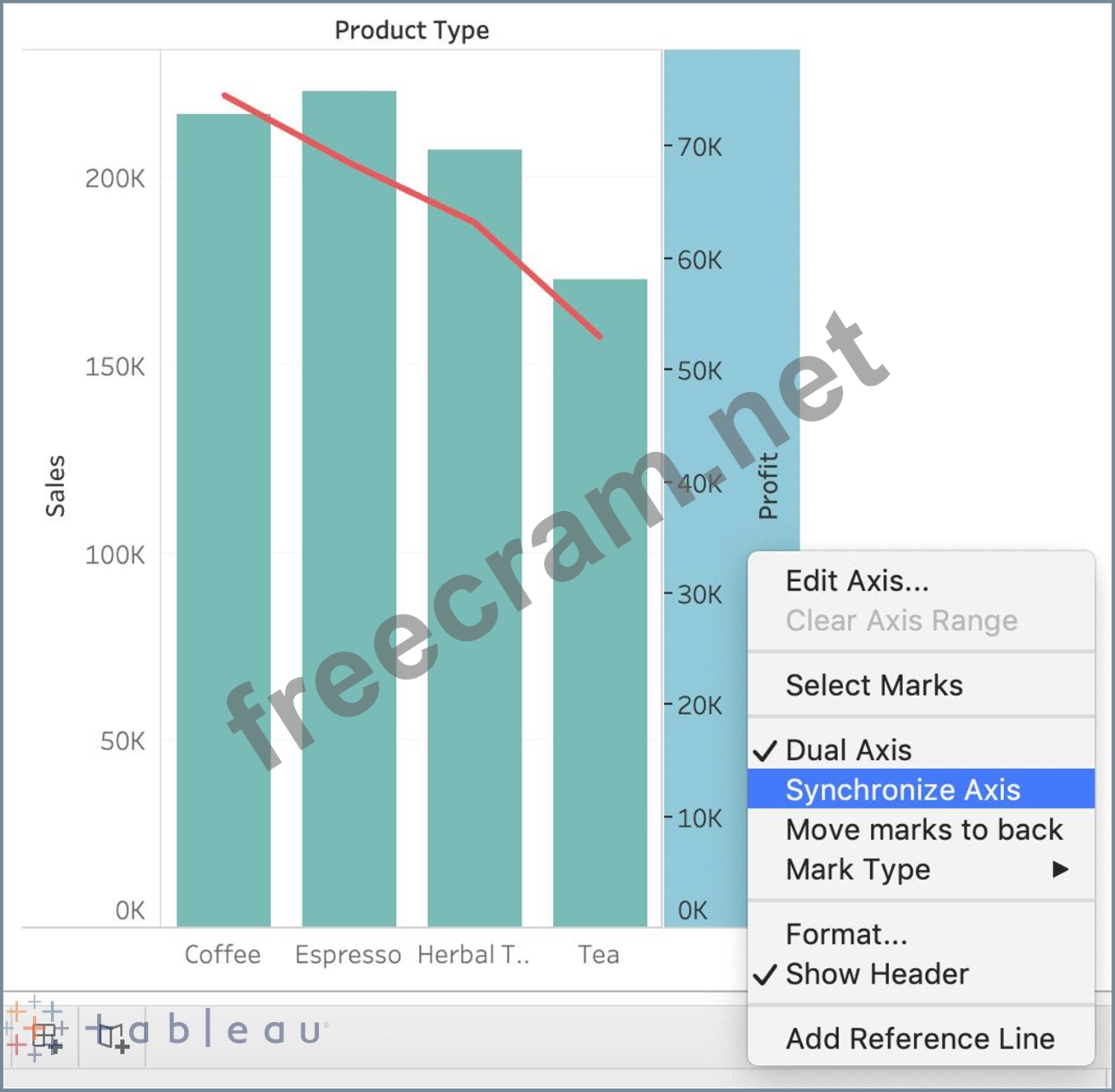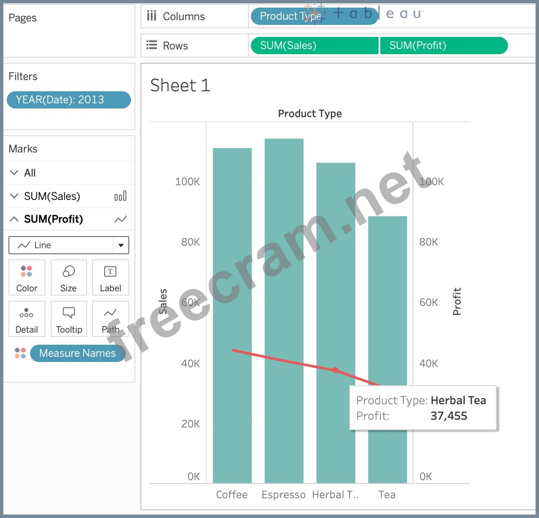 Using the CoffeeChain table, create a Dual Axis chart showing the Sales (Bar chart) and Profit (Line Chart) for each Product type. What was the Profit for the Herbal Tea product type in 2013?