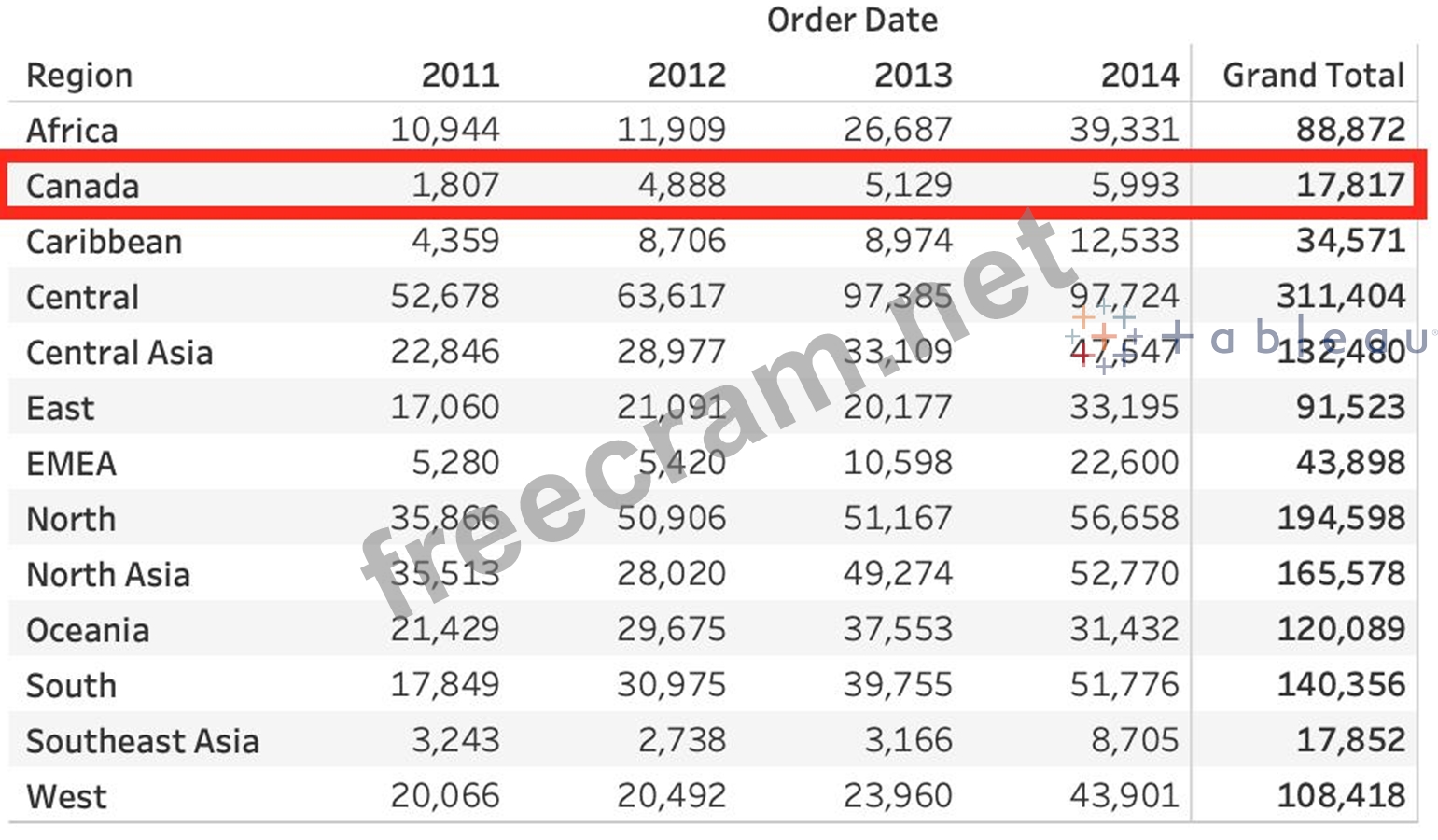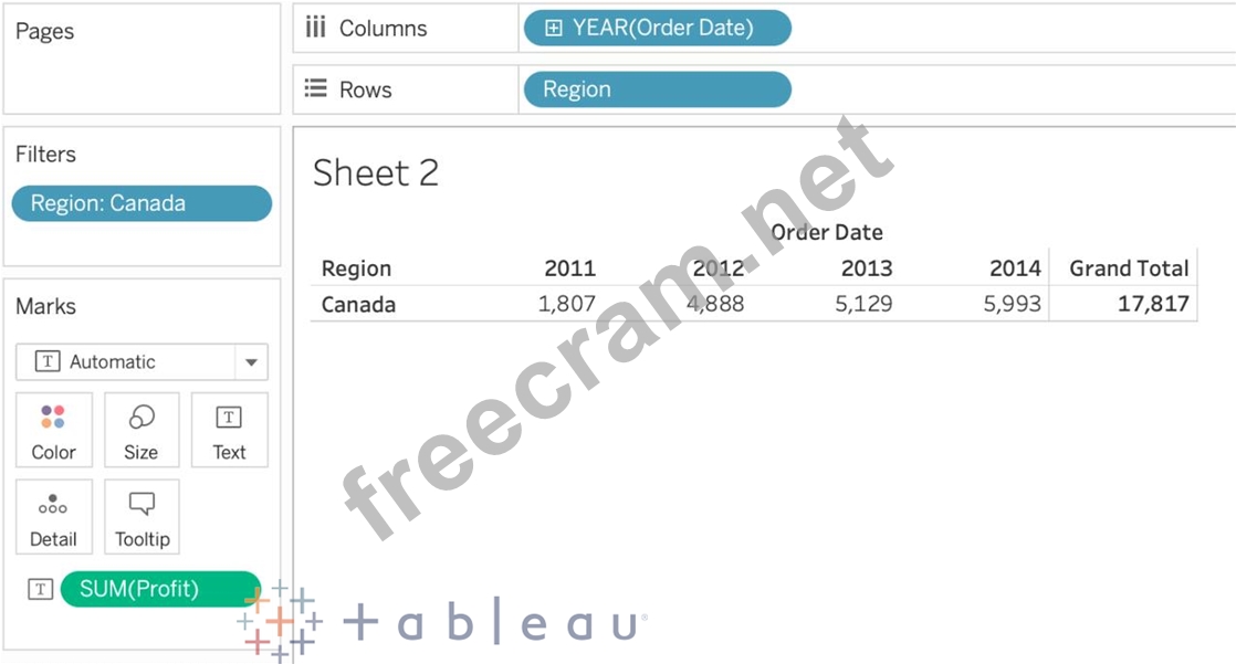 Using the dataset provided, create a crosstab showing the Profit of each Region per Year, then add grand totals to the view. What was the total Profit for Canada in 2012 and the total Profit for Canada for 2011 through 2014, respectively?