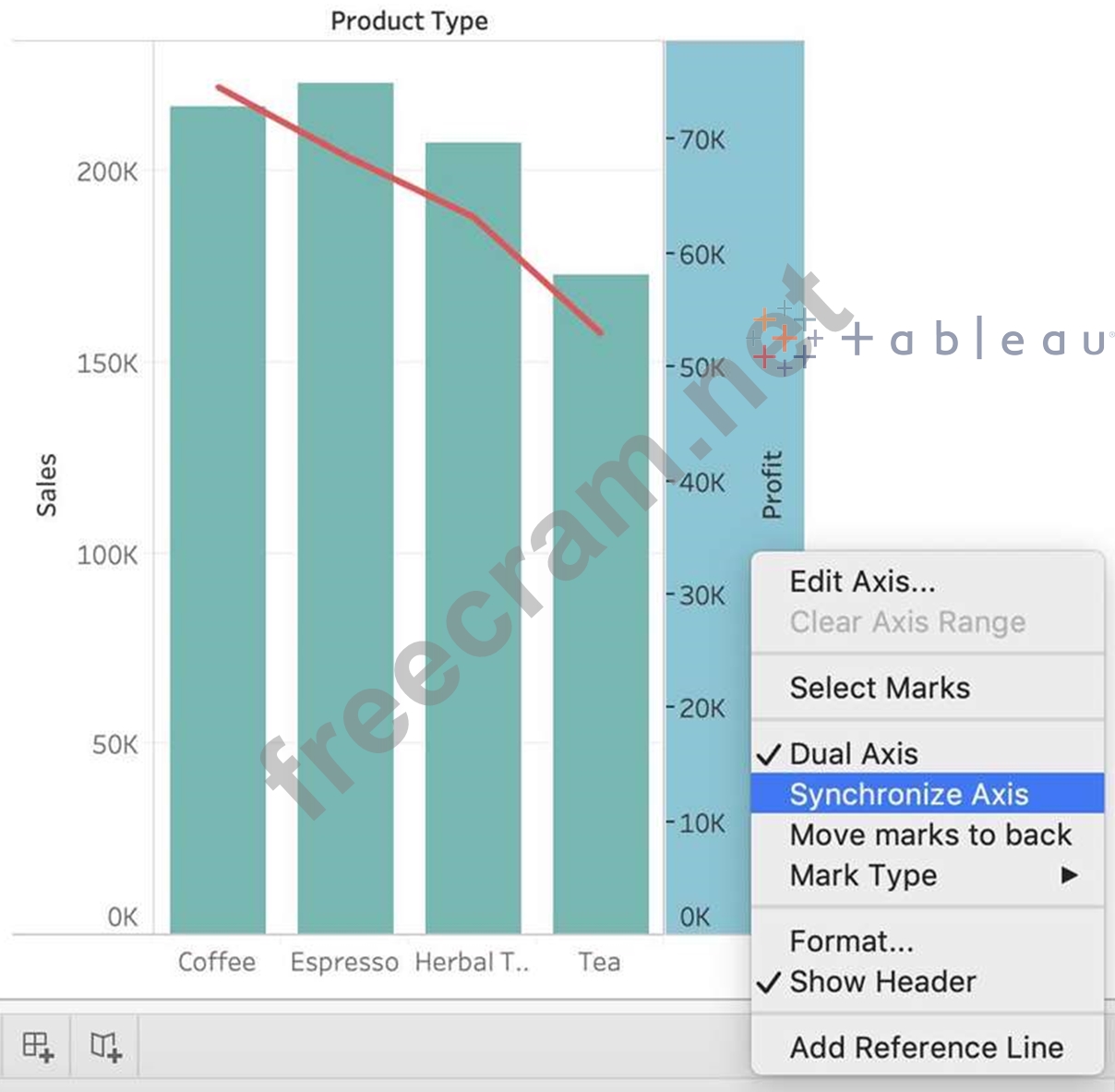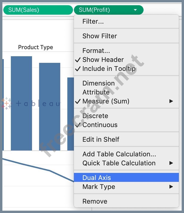 3) Now, click on the Profit pill in the Rows Shelf, and select dual axis: