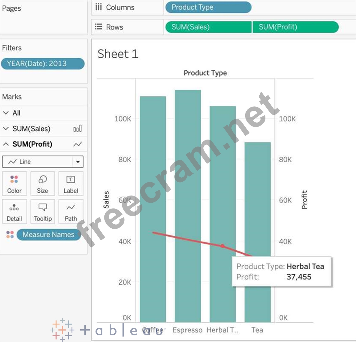 4) Now, in the marks shelf, choose Sales, and change the chart type to bar. Similarly, for Profit, change the chart type to Line.