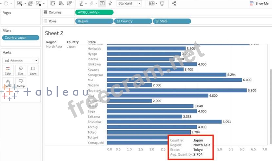 Using the dataset, create a bar chart showing the average Quantity broken down by Region, and filtered by Country to only show Japan. What was the average Quantity in the State of Tokyo?