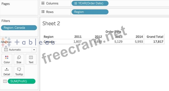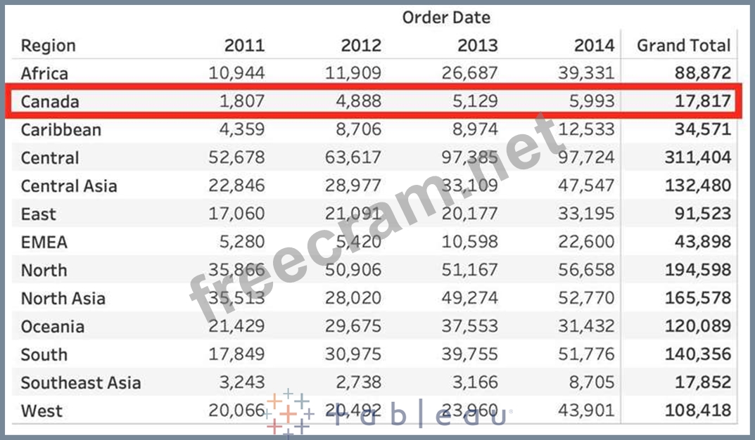 Using the dataset provided, create a crosstab showing the Profit of each Region per Year, then add grand totals to the view. What was the total Profit for Canada in 2012 and the total Profit for Canada for 2011 through