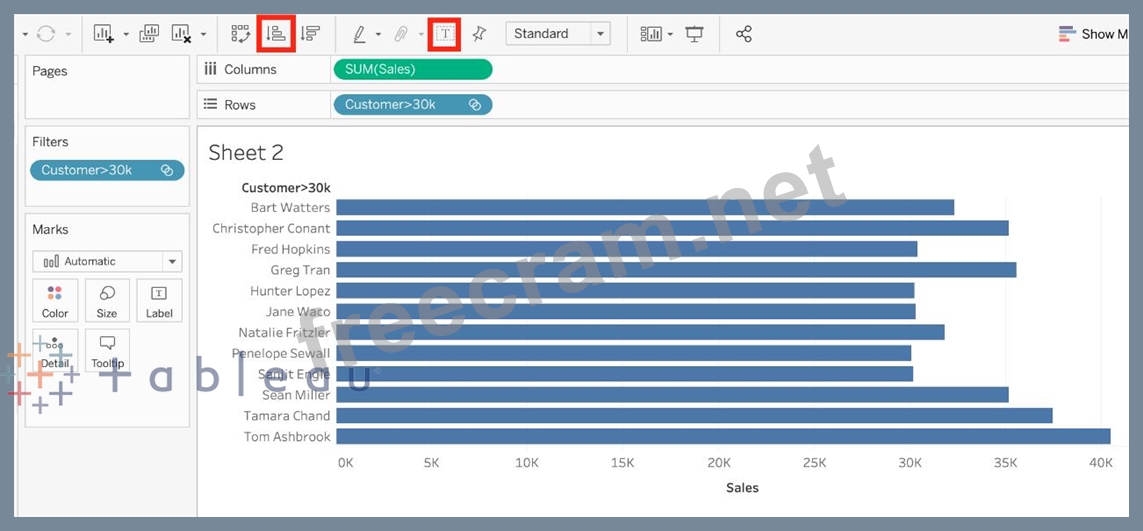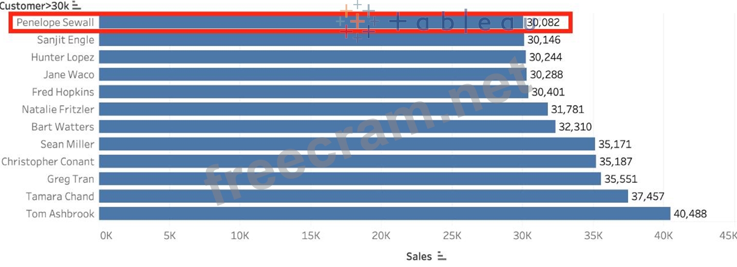 Create a Set containing Customer Names whose Sales are GREATER than 30,000. Which customer had the LEAST sales in this set?