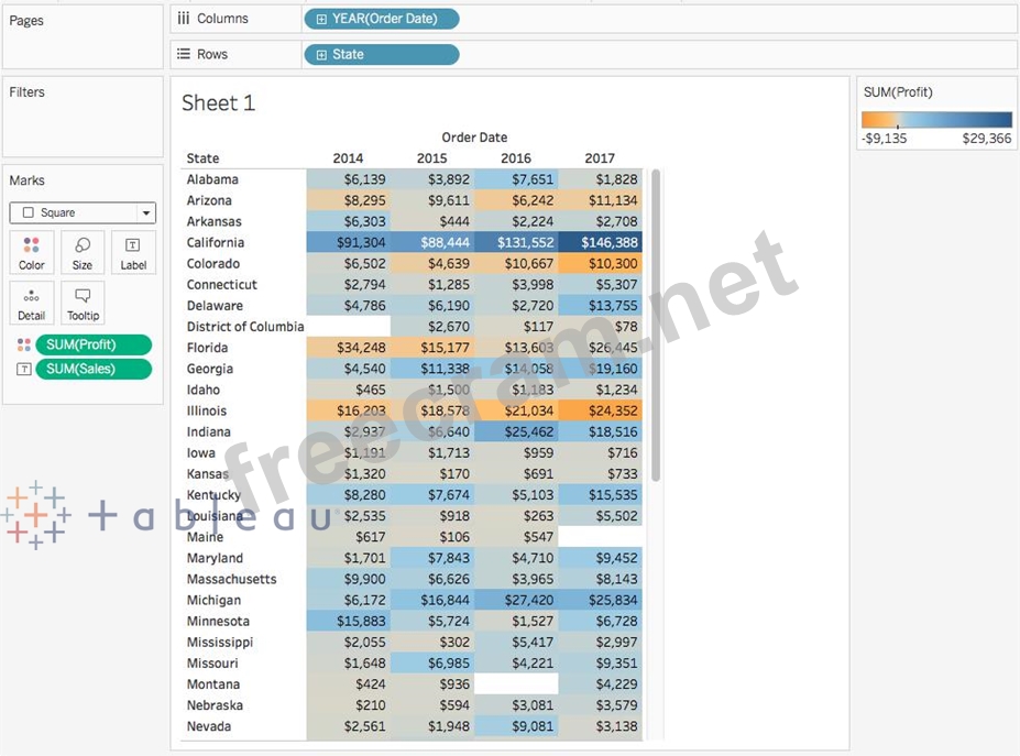 6) From the Data pane, under Measures, drag Profit to Color on the Marks Card.