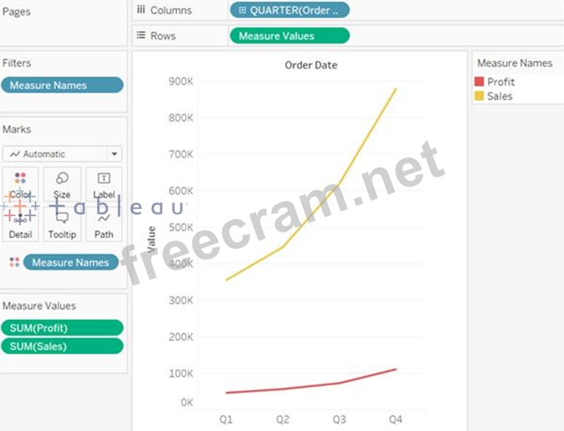 Instead of adding rows and columns to the view, when you blend measures there is a single row or column and all of the values for each measure is shown along one continuous axis. For example, the view below shows quarterly sales and profit on a shared axis.