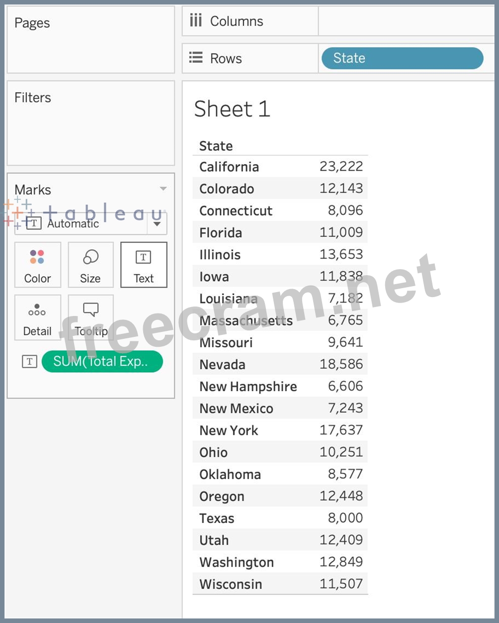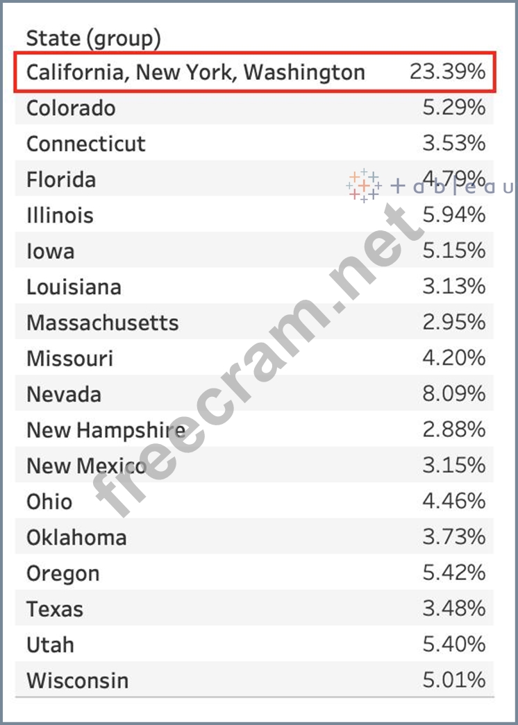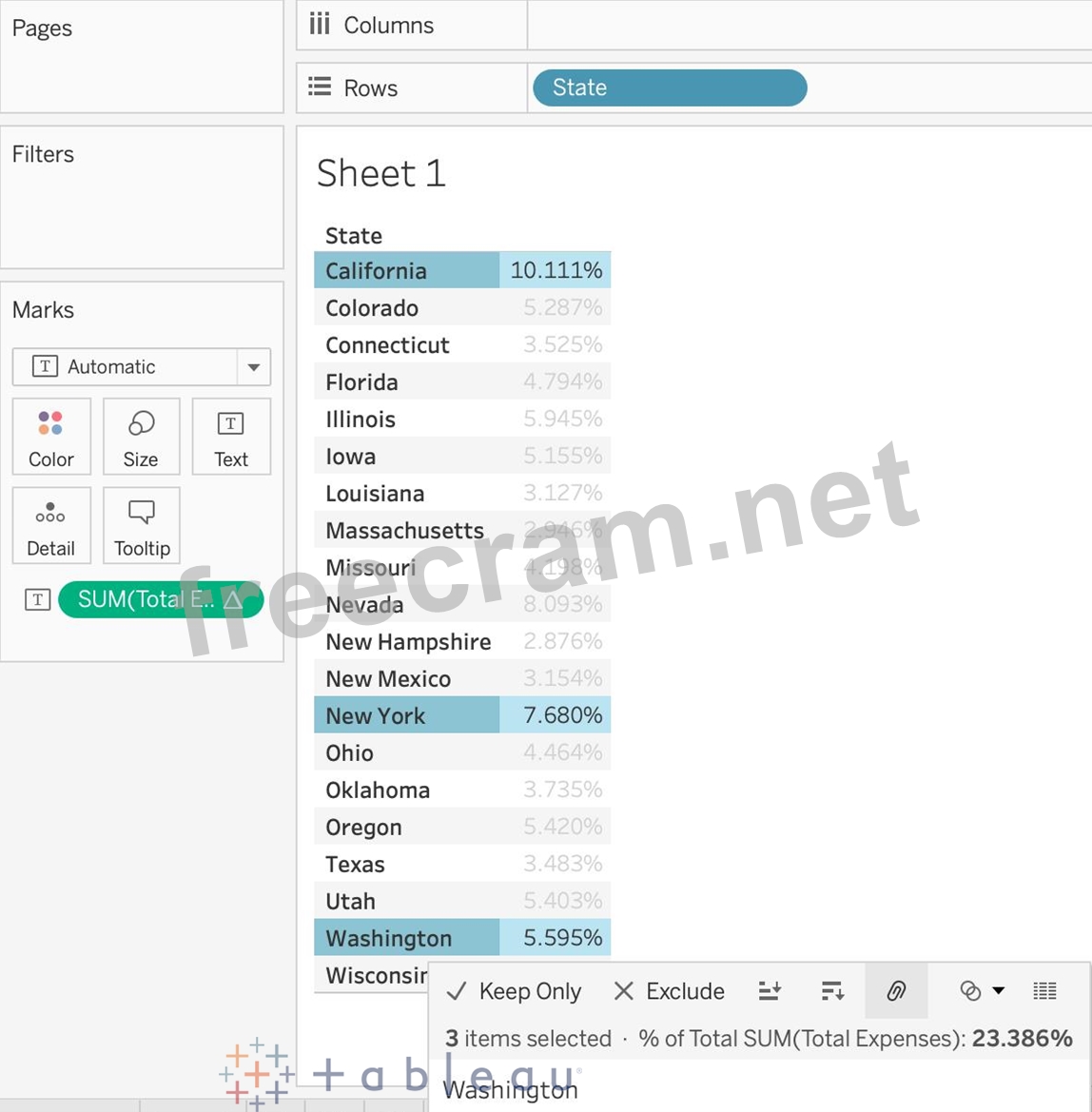 Using the CoffeeChain table, create a crosstab showing the Total Expenses per State and add Column Grand Totals to the view. Now group the states of New York, California and Washington. What percent of the total sales does this group contribute?