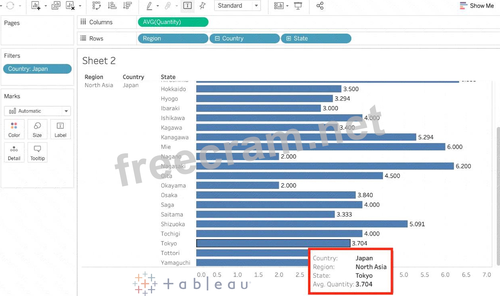 Using the dataset, create a bar chart showing the average Quantity broken down by Region, and filtered by Country to only show Japan. What was the average Quantity in the State of Tokyo?