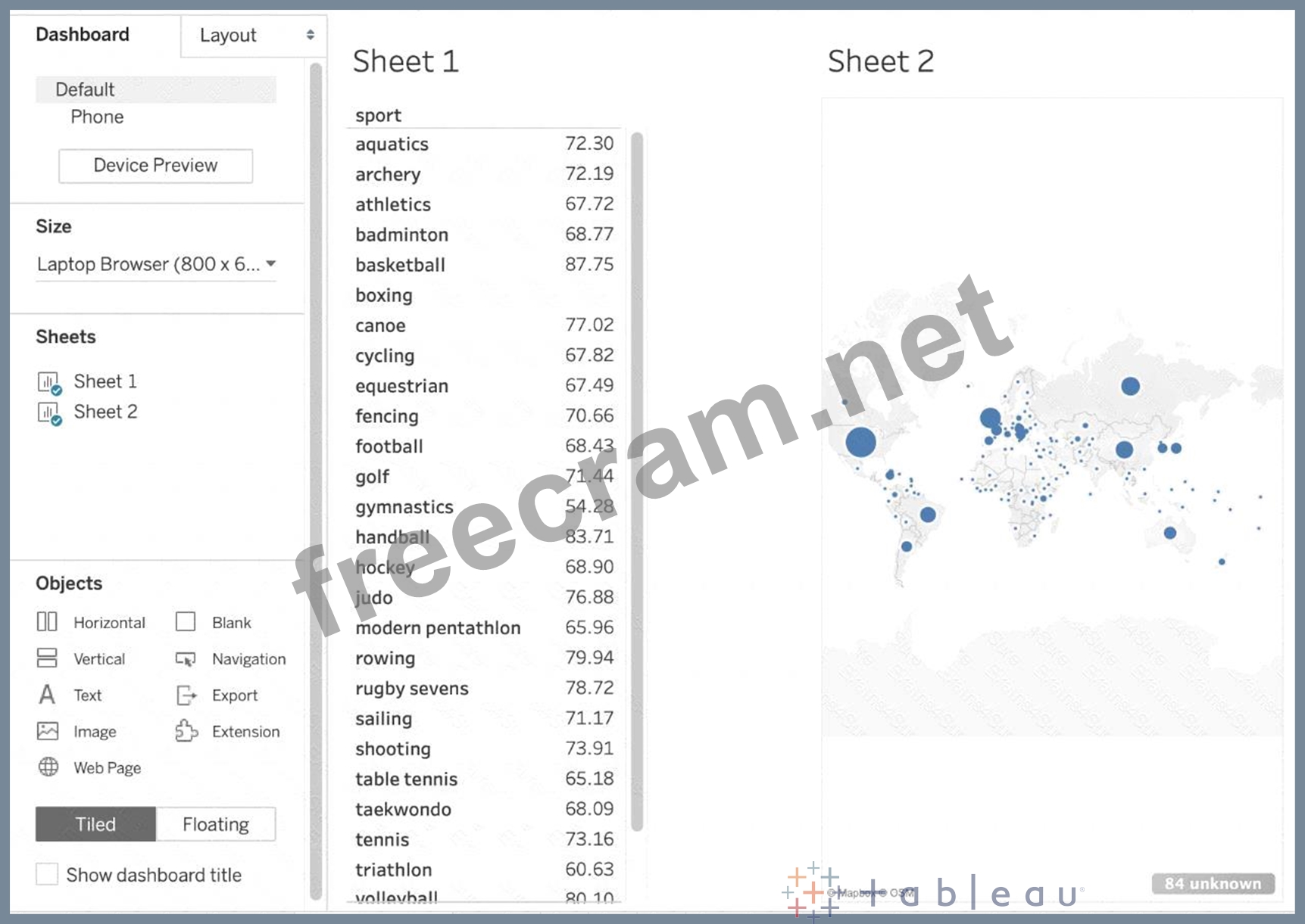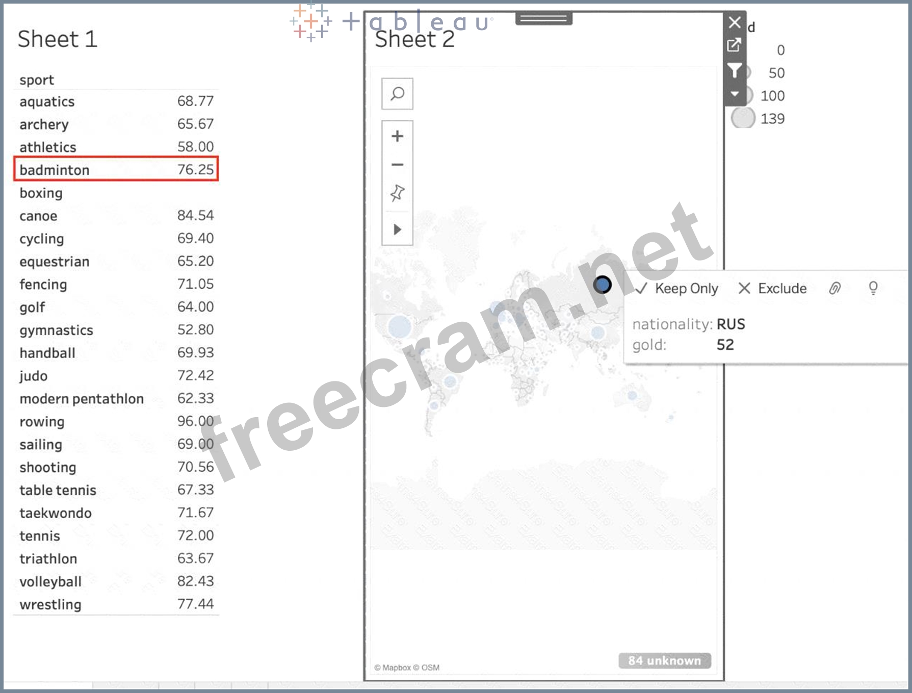 Now, Create a Dashboard containing both these sheets, and Use Sheet 2 as a Filter for Sheet 1. What was the average weight for Badminton in Russia?