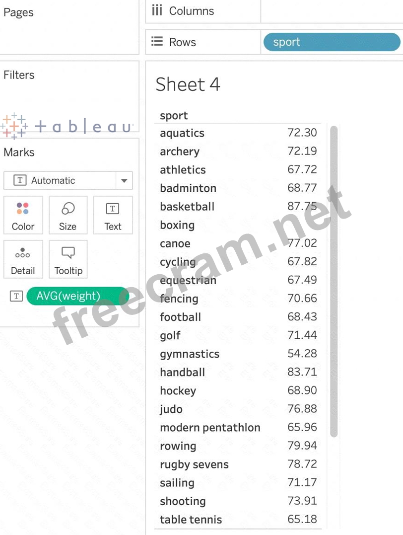 i) Create a sheet with a crosstab showing the Average weight for each sport (Sheet 1) ii) Create a sheet with a Map showing the Total number of gold medals per Country. Use size as a Mark.